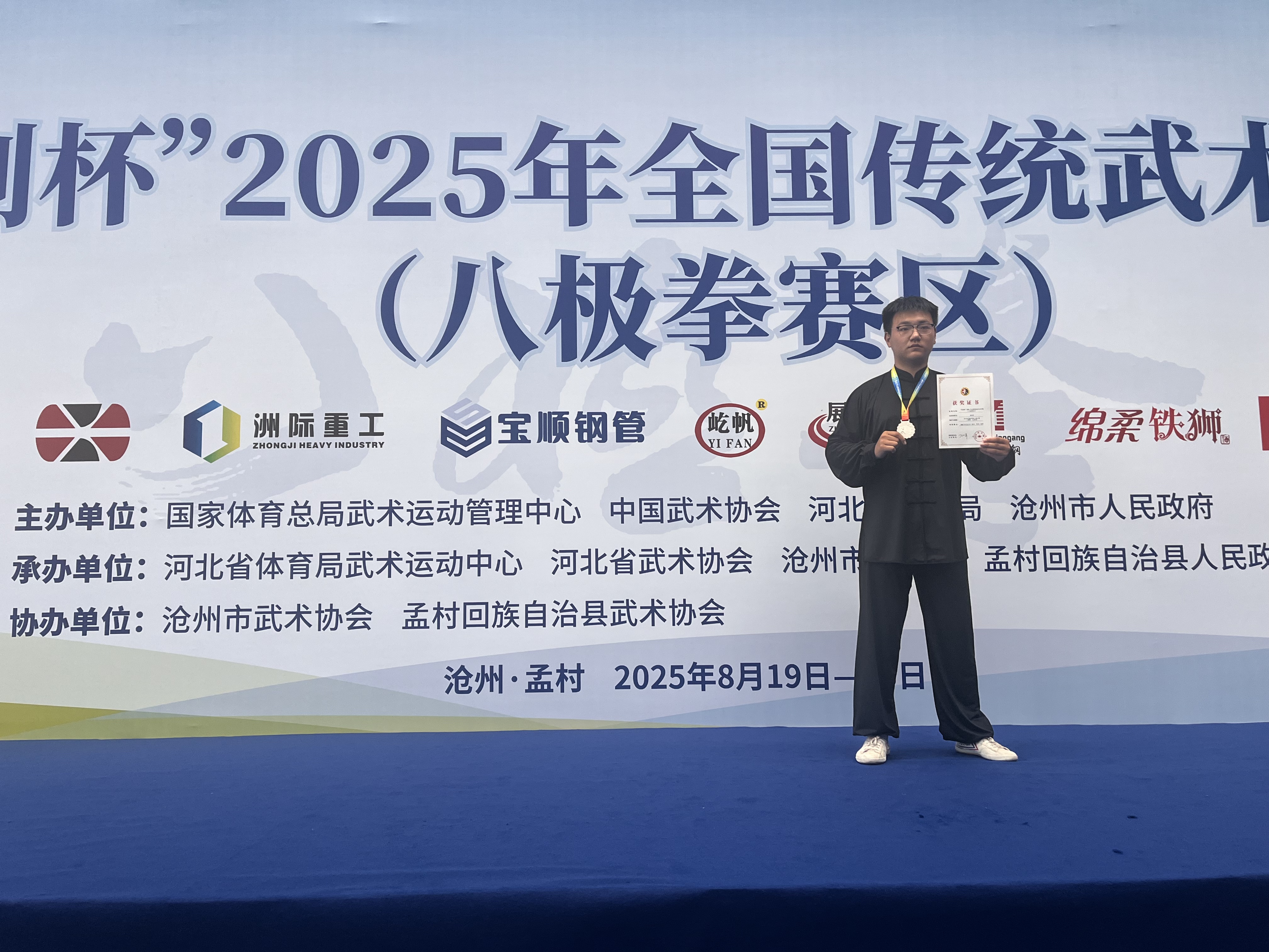 8月21日-23日,2025年全国传统武术公开赛(八极拳赛区)在沧州市孟村回族自治县隆重举行,来自全国各地的82支代表队、1066名运动员和教练员齐聚孟村,以武会友,切磋技艺。我校生物工程学院生物241班李秀宇同学在比赛中表现优异,荣获八极小架二等奖、集体拳术比赛一等奖。