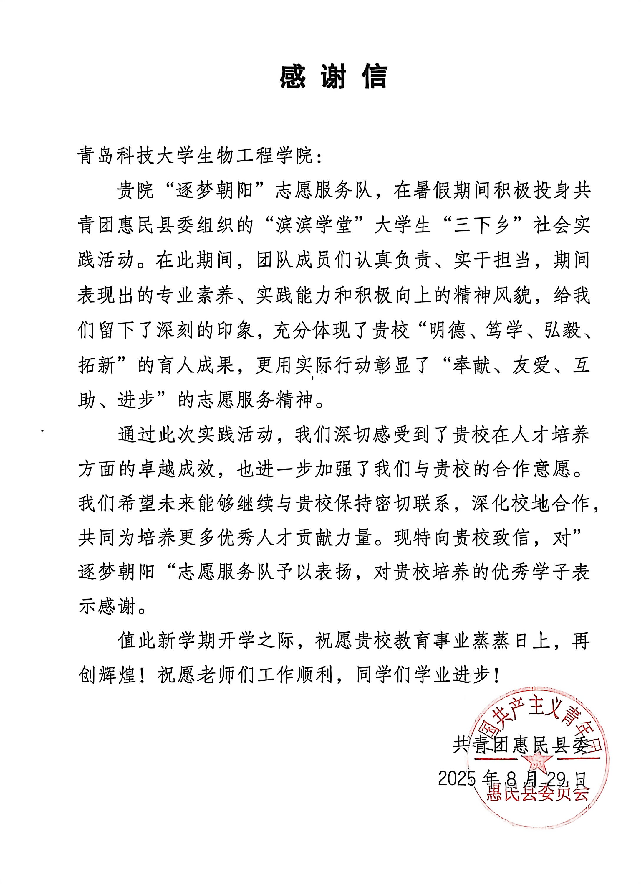 近日,生物工程学院“逐梦朝阳”志愿服务队收到了共青团惠民县委员会发来的感谢信。信中,团委对参与志愿服务的同学们给予了高度肯定和表扬,称赞他们不仅展现了当代大学生的责任感和使命感,更以实际行动为学院和社会树立了榜样。这些同学在志愿服务过程中,不畏艰难,勇于担当,用青春的热情和智慧,为惠民县的教育事业贡献了宝贵的力量,赢得了广泛的社会赞誉。