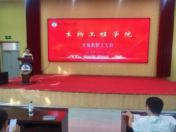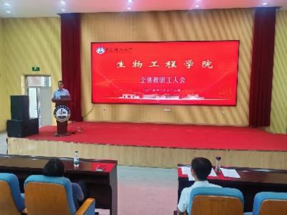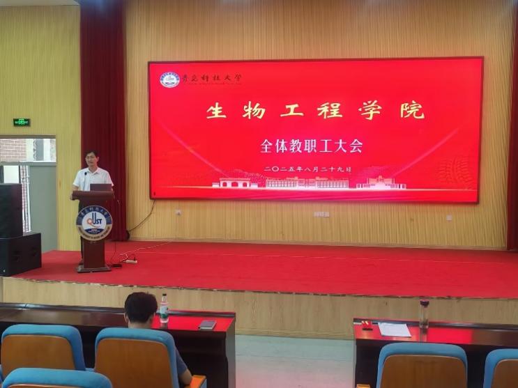 秋风送爽启新程,凝心聚力谋新篇。在学校 “十四五” 规划收官冲刺、“十五五” 规划谋篇布局的关键节点,引导全体教职工以昂扬姿态直面高等教育竞争新形势,2025 年 8 月 29 日下午,生物工程学院于四方校区尚舜报告厅召开 2025 年秋季学期第一次全体教职工大会。会议紧扣 “总结过往明方向、检视问题补短板、部署任务开新局” 核心目标,系统回顾上学期工作、深入查找不足、细化新学期重点任务,并专题学习传达学校 2025 年暑期中层干部培训班上杨天梅书记、陈克正校长的讲话精神。学院党委书记周宪锋主持会议,全体教职工参会。