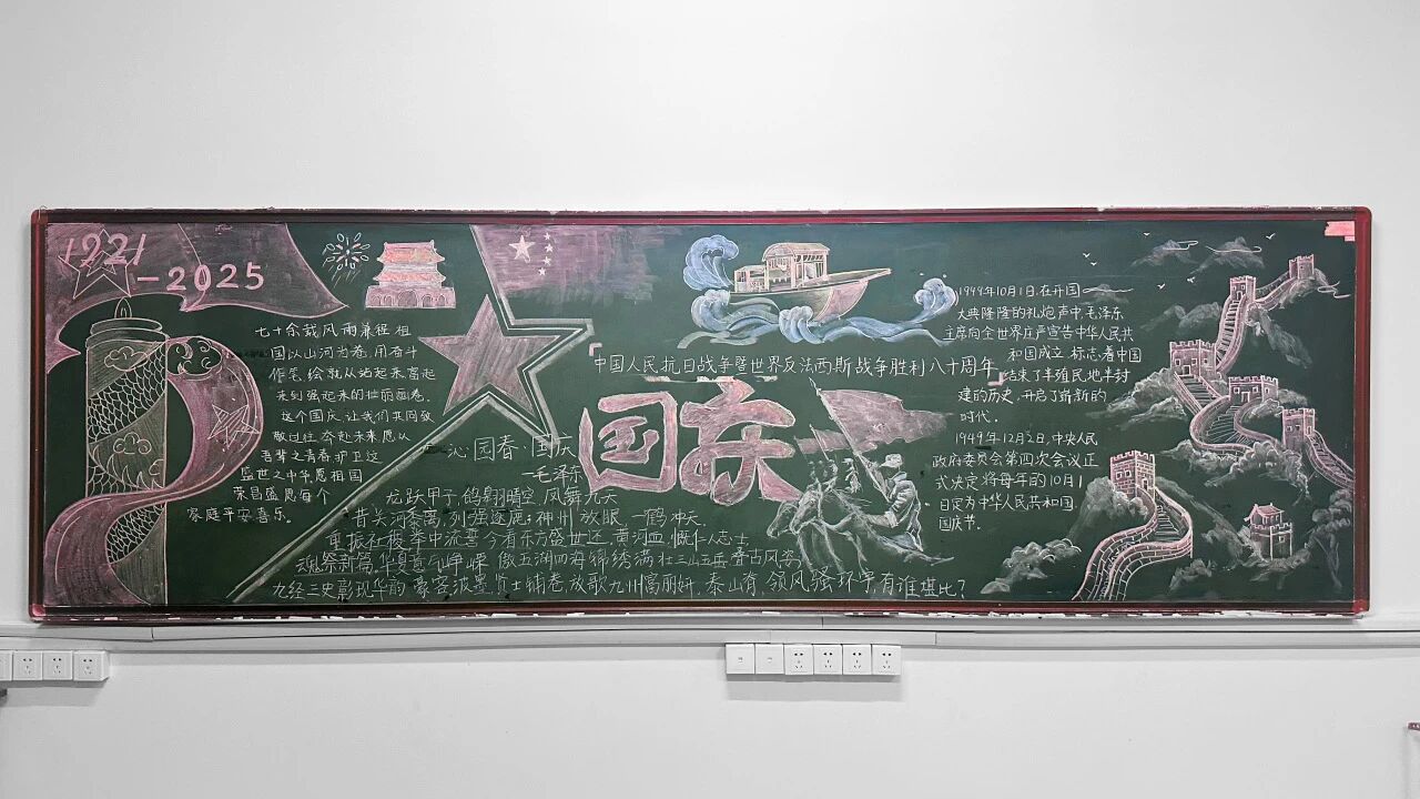 一方黑板,满是赤诚。生物工程学院开展“手绘家国梦,板报贺华诞”主题黑板报创作活动。同学们以黑板为画布,以彩笔为媒,将对祖国的祝福与对时代的赞颂融入一幅幅生动的板报作品中。从开国大典的庄严时刻,到新时代的科技腾飞;从壮丽山河的绝美画卷,到人民幸福的生活图景……同学们用细腻的笔触、鲜明的色彩,勾勒出祖国76年的辉煌历程与盛世风华。每一块黑板报都是一处爱国教育的生动课堂,让路过的师生在驻足观赏间,沉浸式感受祖国的蓬勃发展,厚植家国情怀。