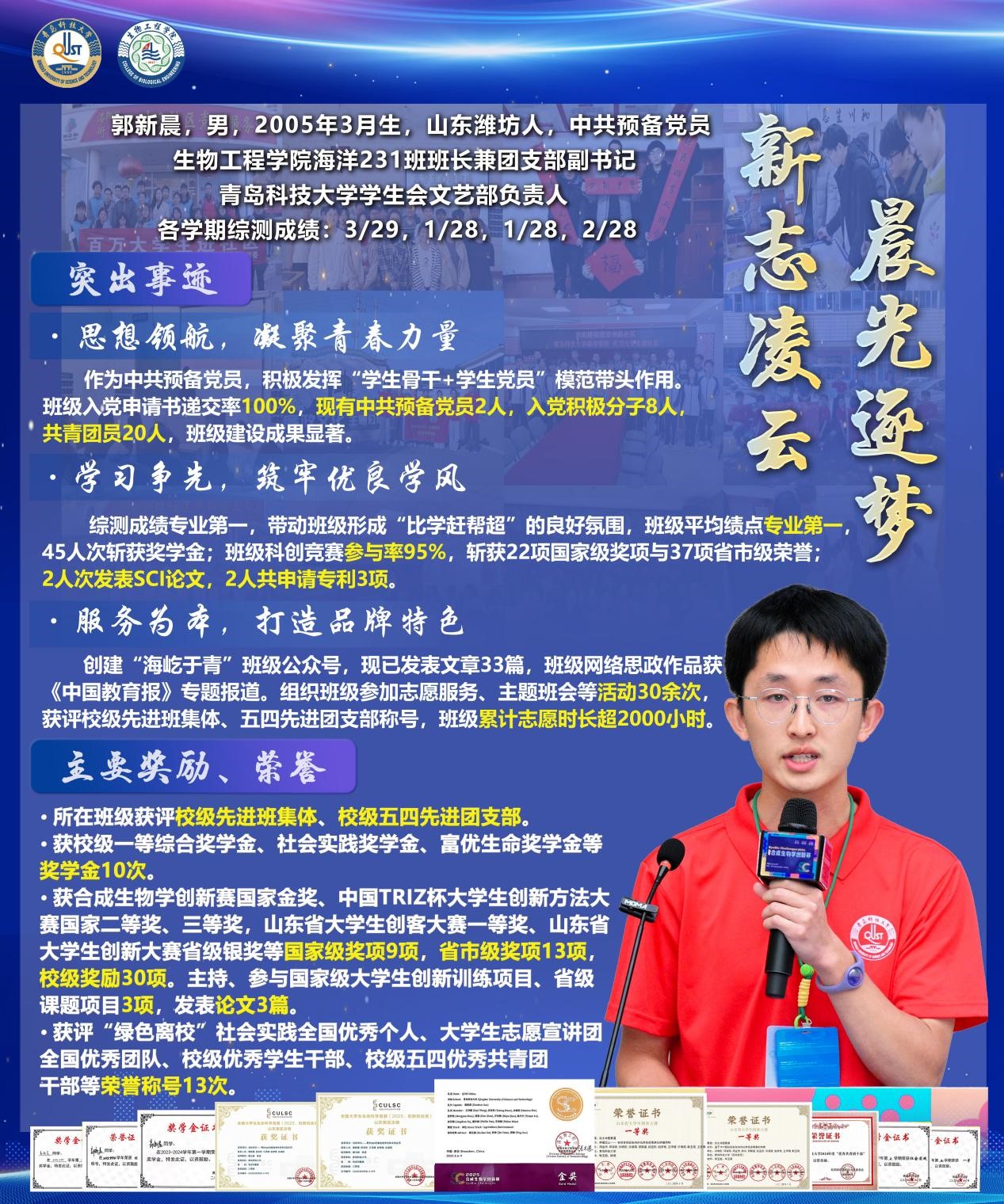 郭新晨,男,中共预备党员,生物工程学院海洋科学231班班长;校学生会文艺部负责人(2024.09至今)。