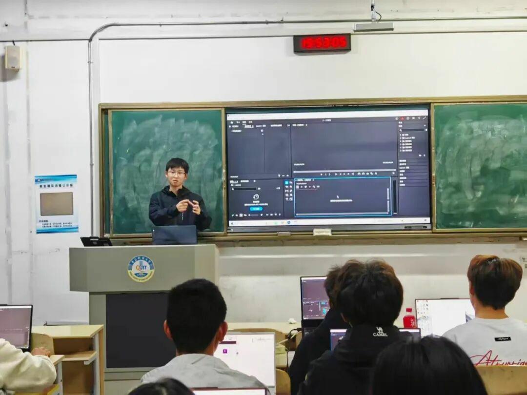 培训中,蒲一鸣以“理论讲解+案例演示+实操指导”的方式展开教学。他首先系统介绍了PR软件的界面布局、核心功能模块及基础操作逻辑,帮助学员快速建立对软件的整体认知。随后,结合学院往期优秀宣传视频案例,从素材导入、剪辑拼接、转场设计到字幕添加、音频处理等环节,分步演示视频制作全流程,并重点讲解了调色技巧、节奏把控等提升作品质感的关键方法。在实践环节,学员们分组进行操作演练,围绕“学院活动记录”“实验室日常”等主题尝试剪辑短视频。蒲一鸣穿梭于各组之间,针对学员们提出的“素材衔接不流畅”“转场效果生硬”等问题进行一对一指导,通过现场调试参数、演示优化方案,帮助大家突破操作瓶颈。互动交流中,学员们结合自身宣传工作经历分享困惑与心得,现场学习氛围浓厚。
