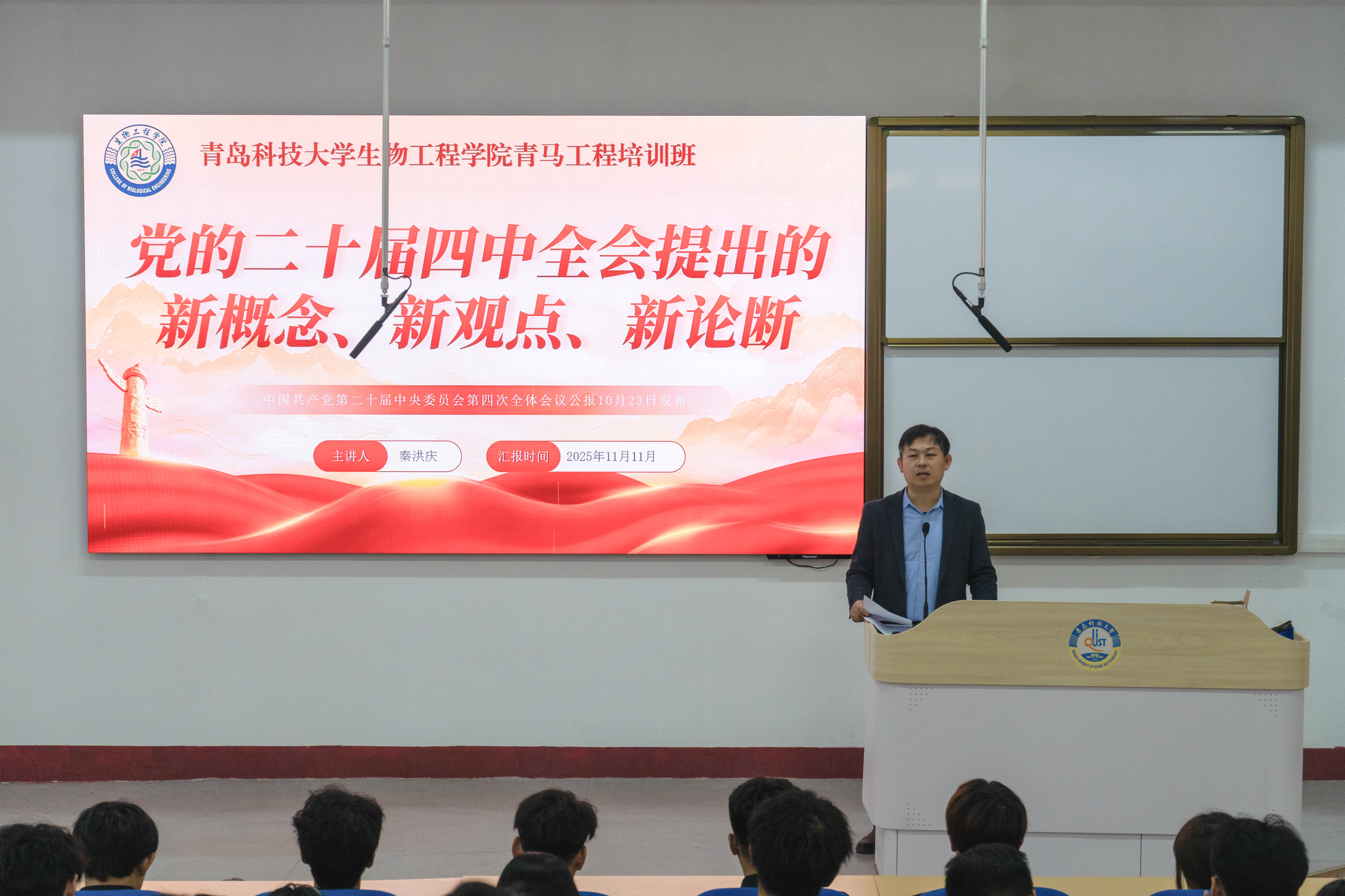 为了提升学生骨干的政治素养和理论水平,引导学生深入学习党的最新理论成果,11月11日下午,生物工程学院在2教101教室举行青马工程培训,团委书记秦洪庆作了题为《党的二十届四中全会提出的新概念、新观点、新论断》的培训。生物工程学院青马学员100余人参加培训。