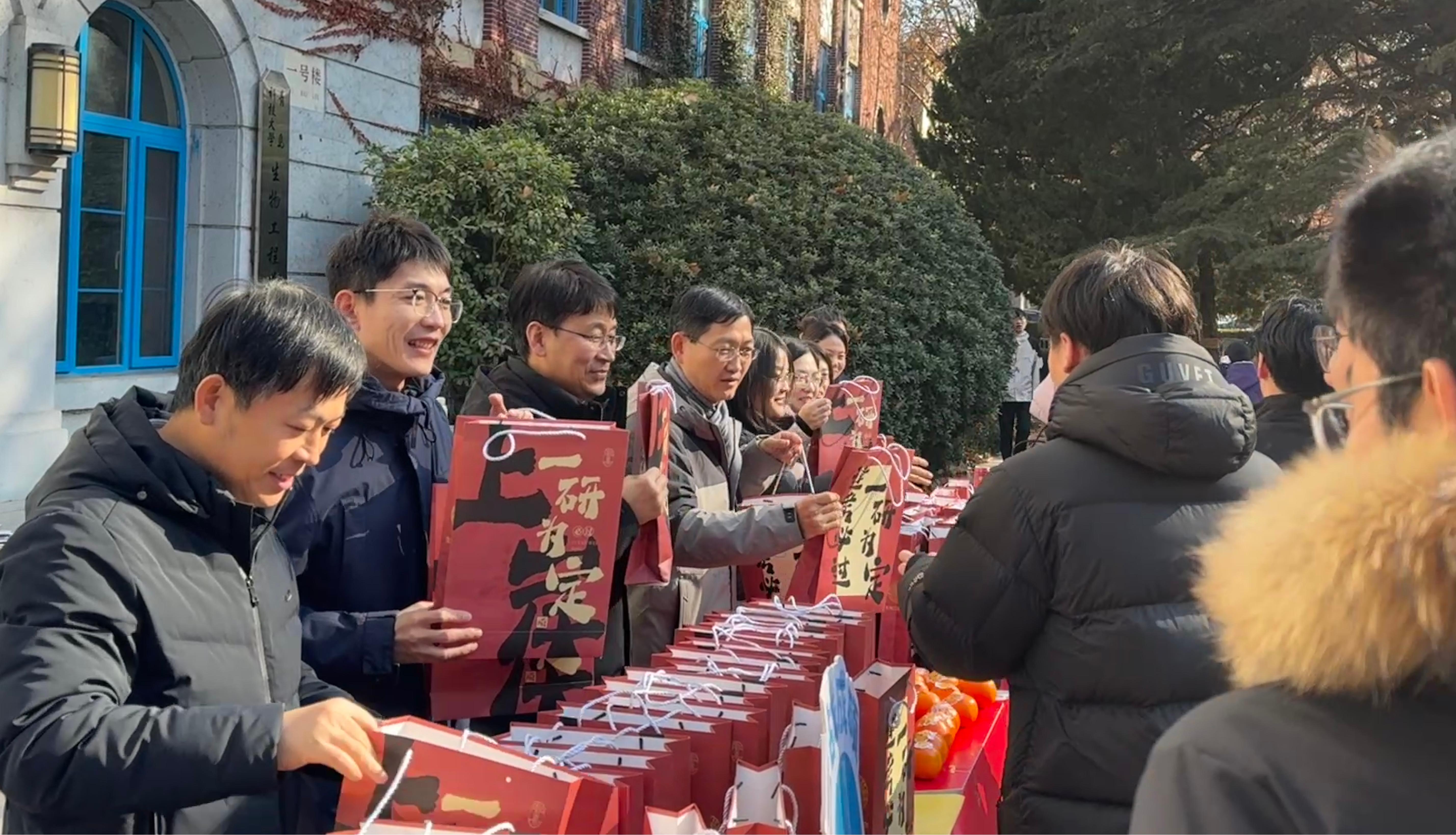 学院党委书记周宪锋、院长顾玉超、党委副书记兼副院长刘浩、副院长孟祥民、团委书记兼学工办主任秦洪庆及各年级辅导员、2022级班主任代表学院为2022级考研学子们分发礼包,这份“考研礼包”中藏着满满的“夺冠密码”:饱满橙子寓意着“橙风破浪,一举成硕”,愿学子们考场披荆斩棘、势不可当;香甜旺仔牛奶承载着“旺力全开,高分上岸”的祝福,盼大家发挥超常、实力爆棚;简约实用的笔记本,寄托着“笔耕不辍,研途笃行”的期许,愿学子们在逐梦路上沉淀每一份积累;贴心暖宝宝化身“备考铠甲”,为挑灯夜战的追梦人驱散寒意,守护每一份专注与坚守。学院始终关注考研学子的备考状态,此次礼包发放既是对大家坚持与付出的肯定,更是对学子们金榜题名的殷切期盼。