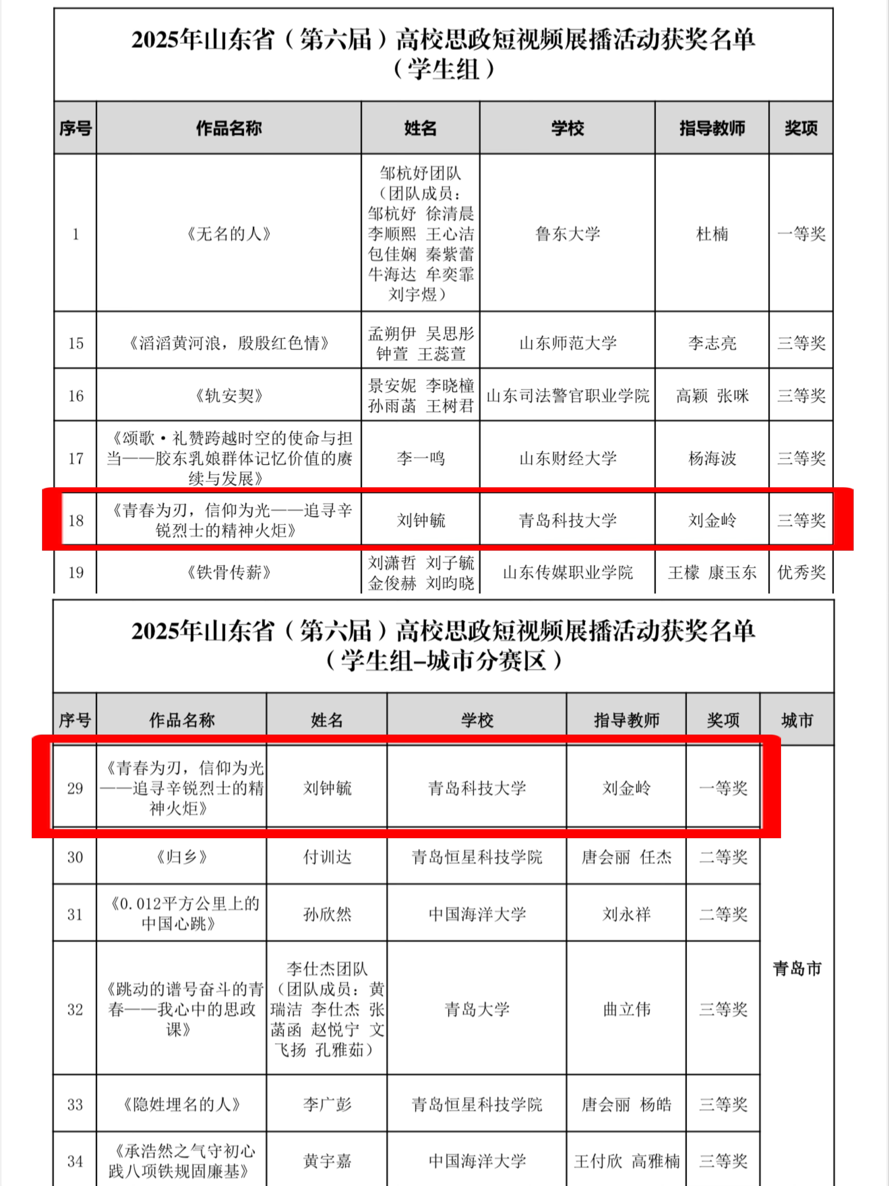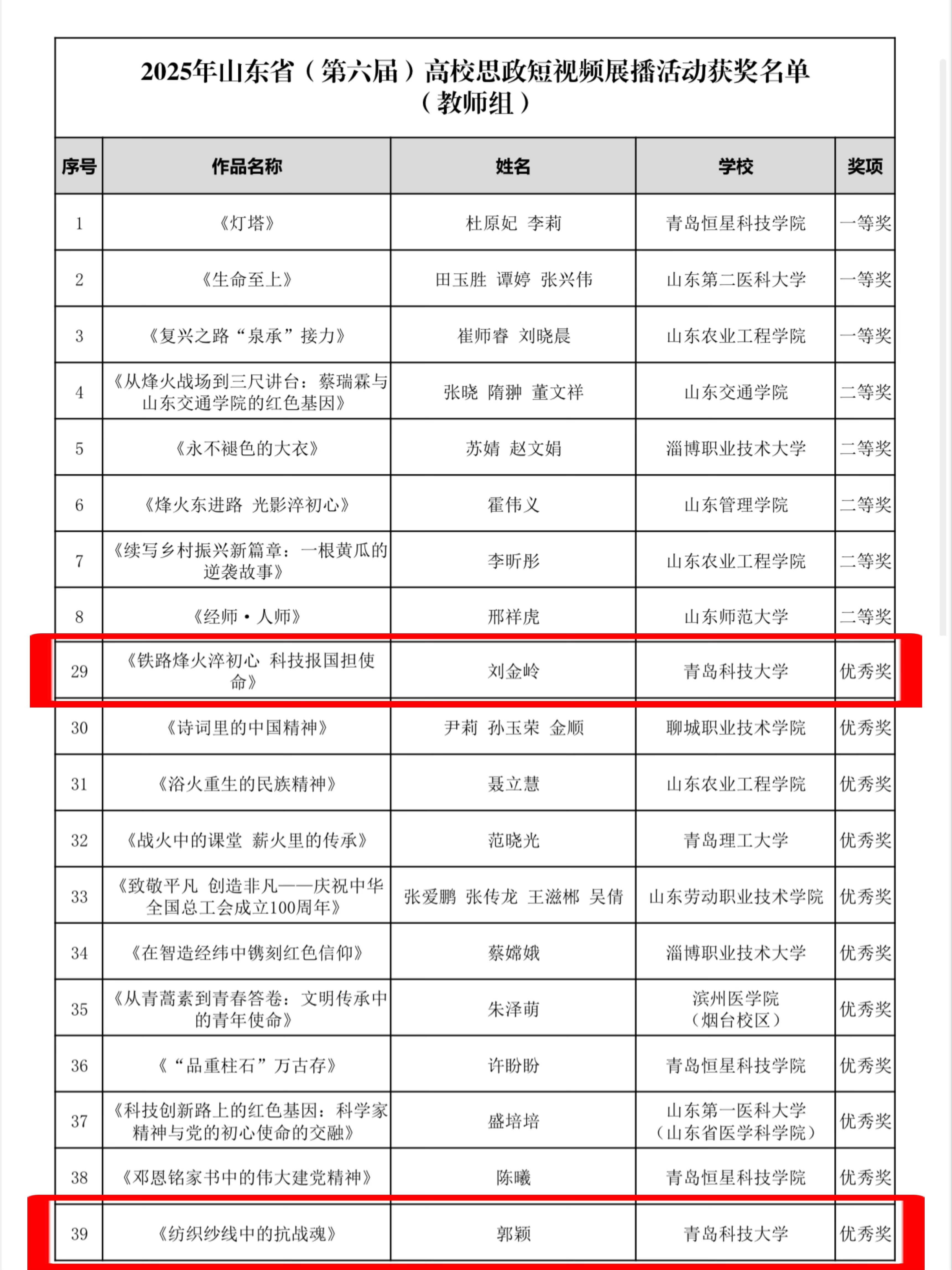 近期,由山东省委宣传部指导,大众报业集团(大众日报社)、省广播电视局联合举办的2025年山东省(第六届)高校思政短视频展播活动已评选结束。生物工程学院作品《铁路烽火淬初心 科技报国担使命》(作者:刘金岭)、《纺织纱线中的抗战魂》(作者:郭颖)获山东省教师组优秀奖;学生刘钟毓以作品《青春为刃,信仰为光——追寻辛锐烈士的精神火炬》获山东省学生组三等奖、青岛市一等奖,刘金岭获评优秀指导教师奖。
