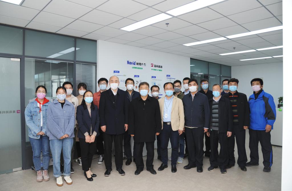 简码基因科技有限公司总经理董雪峰汇报了新冠病毒核酸检测试剂盒项目的进展情况。会后,校领导与参与研发活动的师生合影留念。