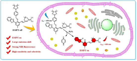 过氧化氢(H2O2)是生物体内常见的活性氧物种之一,对细胞信号传导、机体免疫反应等正常生理功能的实现具有重要作用,被视为是阿尔兹海默症、肿瘤、心血管疾病、亨廷顿病和帕金森病等多种疾病的重要生物标志物。近日,海洋科学与生物工程学院王晓春教授团队在国际著名期刊《Sensors and Actuators B:Chemical》(JCR中科院一区Top)发表了题目为“H2O2-targeted ratiometric chemosensor with long-wavelength emission and large emission shift based on ESIPT mechanism for bioimaging application”的研究论文(Sensors & Actuators: B. Chemical,2023,393,134301)。该论文第一作者为课题组2020级硕士研究生陈瑾,王晓春教授为独立通讯作者,青岛科技大学为独立通讯单位。
