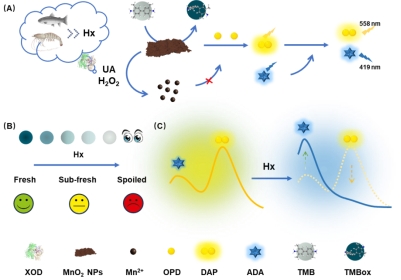 近期,青岛科技大学生物工程学院王晓琨副教授团队在水产品新鲜度评估领域取得了重要进展。团队创新性地开发了一种基于催化反应的次黄嘌呤(Hx)比色-比率荧光双模式检测方法,实现了水产品新鲜度的快速、灵敏、可靠评估。研究成果以题为《The colorimetric and ratiometric fluorescence dual-mode detection of hypoxanthine through catalytic reactions for assessing aquatic product freshness》的研究论文,发表在国际著名期刊《Food Chemistry》(一区Top,IF=8.5)。