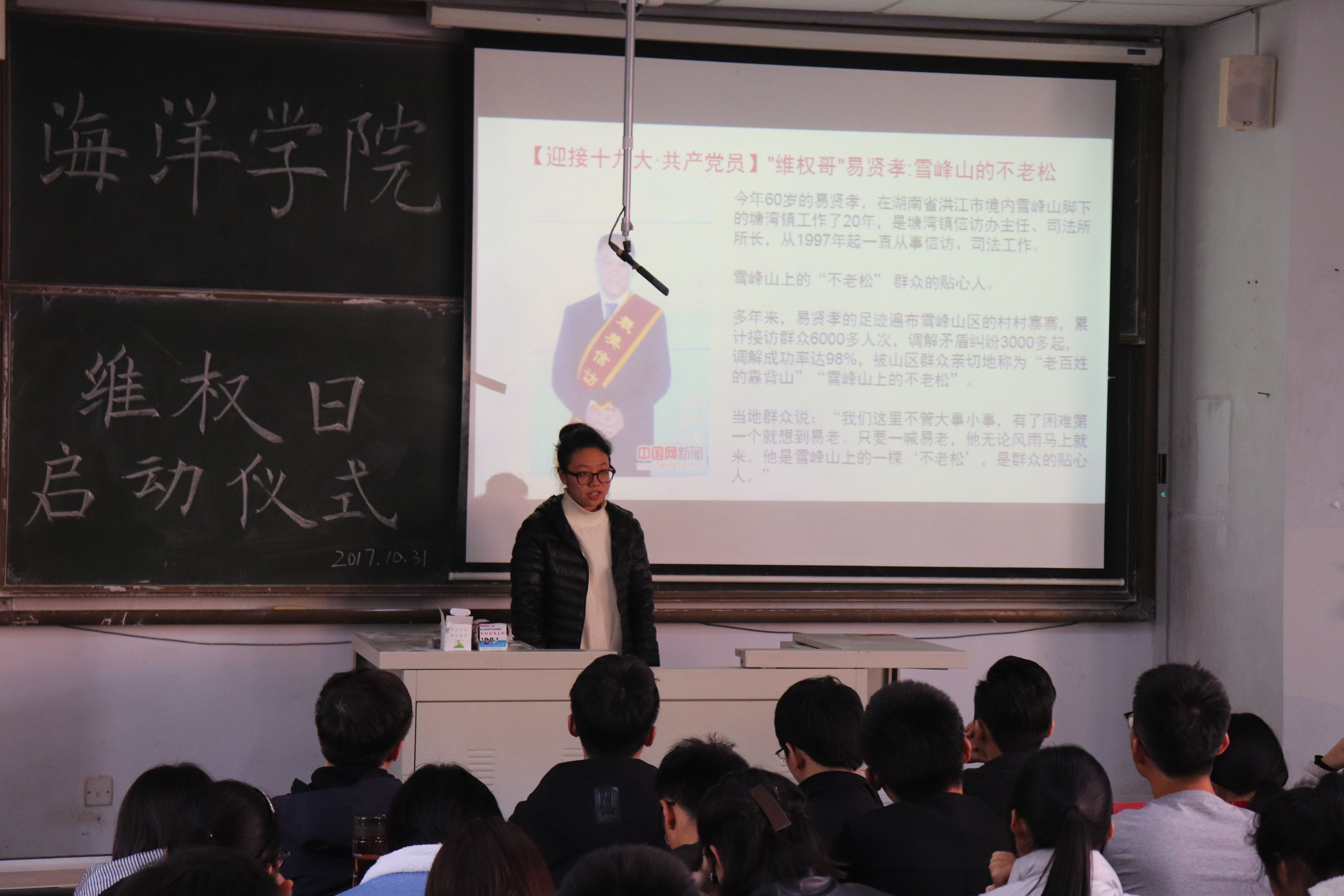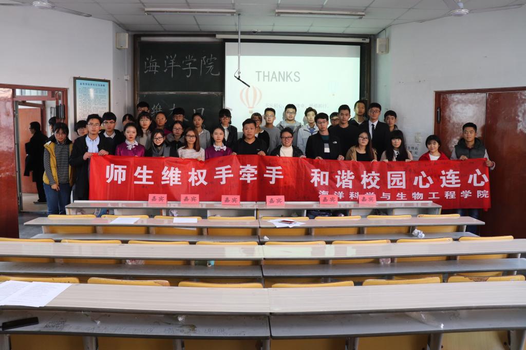 为了切实做好学生权益保障工作、了解民情民意,10月31日下午两点,海洋学院维权日启动仪式在一教301隆重举行,海洋学院副主席付洪喜、杨文艺、陈震,纪检部部长王炳威以及海洋学院15级、16级、17级各班生活委员和舍长等学生干部参加了本次启动仪式。