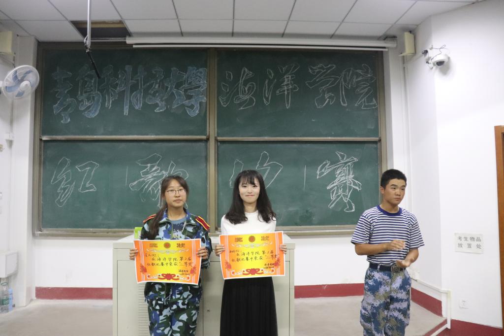 为展现当代大学生爱国爱校、朝气蓬勃、昂扬向上的精神面貌,9月20日下午6:30,海洋学院在二教317举办了“歌颂祖国”新生红歌合唱比赛。2018级新生教官、分团委老师刘金岭、“红色引擎”党员工作站站长李慧敏和学生会主席团成员出席了本次活动。