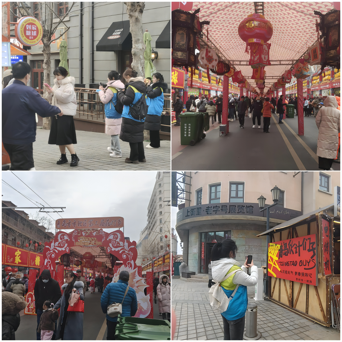 为积极宣传地方传统文化,给家乡增光添彩,海洋学院组织学生组成“青年采风团”进行志愿服务活动,分小组在大鲍岛文化休闲街区对“民俗好物”“特色美食”“沉浸展演”“创意地标”四大板块进行志愿服务,并拍照打卡,将图片、视频等发布到微博、微信及抖音等新媒体平台,对2024青岛萝卜·元宵·糖球会和青年采风实践进行广泛宣传。
