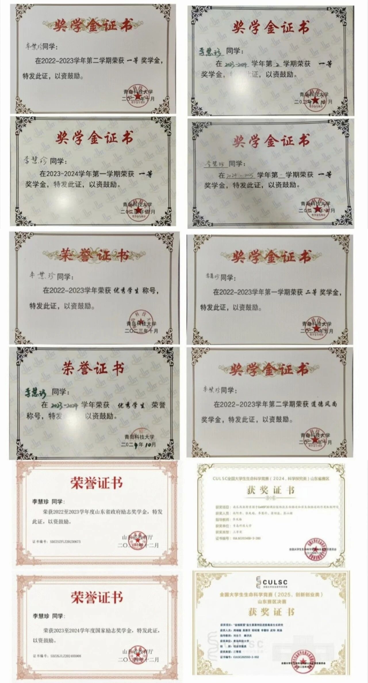 荣获第九届全国大学生生命科学大赛(科学探究类)山东省赛区省三等奖,第十届全国大学生生命科学大赛(创新创业类)山东省赛区省三等奖。获国家励志奖学金,山东省政府励志奖学金、一等综合奖学金、二等综合奖学金、道德风尚奖学金等奖励及优秀学生荣誉称号10余项。