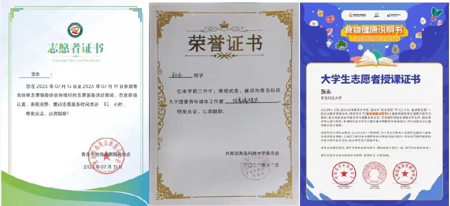 她积极参与志愿活动,注重在实践中增长才干。积极参与“返家乡”社会实践、青岛欢乐滨海马拉松、青岛地铁志愿服务、“一起云支教”、“悦读”书屋、“海创汇”、“小浪花”青年志愿服务队等志愿服务十余项,累计服务时长超400小时。这些经历不仅丰富了她的阅历,也锻炼了她的沟通协调、组织执行等多方面能力。