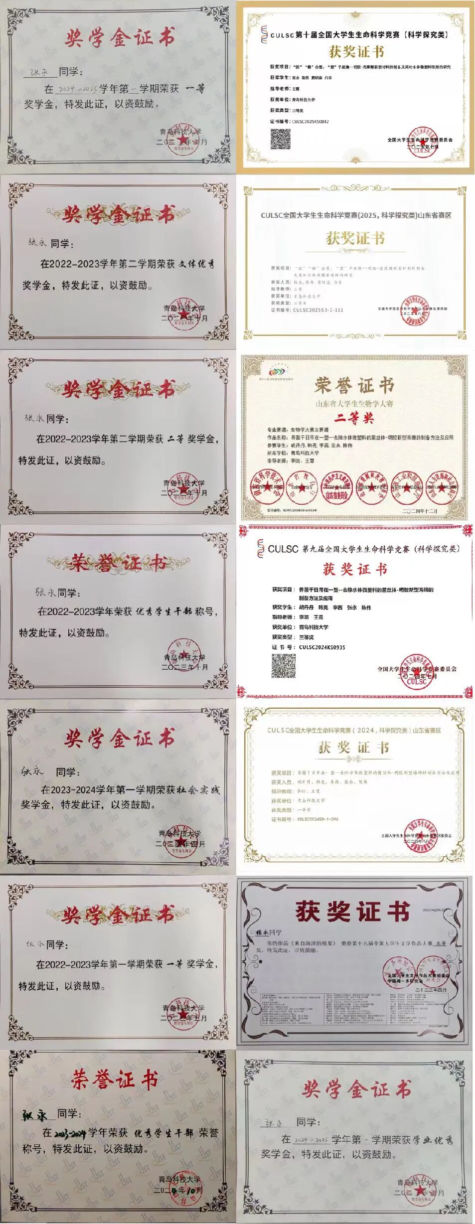 获2024全国大学生生命科学竞赛国家三等奖及省级一等奖、2025全国大学生生命科学竞赛国家三等奖及省级二等奖(负责人)、2024山东省大学生生物学大赛省级二等奖、2025山东省大学生生物学大赛省级三等奖(负责人)、第十八届全国大学生文学作品大赛三等奖,并参与大学生创新创业校级立项;