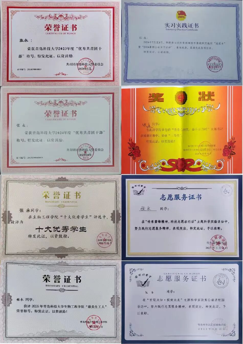荣获校“优秀学生干部”称号3次、校2023年度“优秀共青团干部”和2024年度“优秀共青团干部”称号各1次、院“十大优秀学生”称号、“最美生工人”称号;