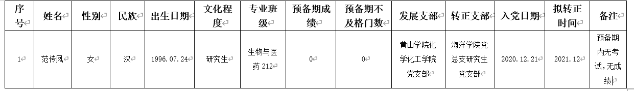经海洋学院党总支研究生党支部研究,拟将范传凤同志转为中共正式党员,现将其有关情况予以公示。