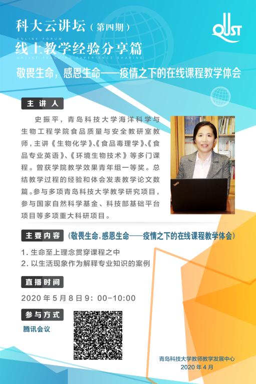 2020年5月8日上午9时,海洋学院教师史振平在第“四期科大云讲坛”开展“敬畏生命,感恩生命——疫情之下的在线课程教学体会”经验交流。史老师从“在课程过程中贯穿生命至上理念、以生活现象作为解释专业知识的案例、学生在课堂和课下交流及反馈情况”三个方面进行了总结和交流。