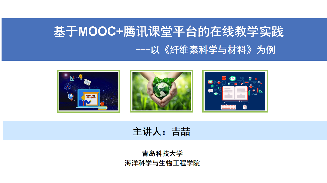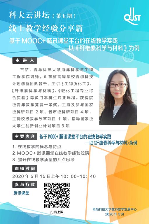 2020年5月15日上午10时,海洋学院教师吉喆在第五期科大云讲坛举行了“基于MOOC+腾讯课堂平台的在线教学实践---以《纤维素科学与材料》为例”的经验交流活动。吉老师充分分析了在线教学的特点及优势,结合讲授的专业课程,对在线教学的思路设计做了充分讲解,并针对“如何利用现有的MOOC和腾讯课堂直播平台,开展生动有趣的在线教学”做了详细汇报。最后,吉老师结合个人教学经验,对提升线上教学质量的策略进行了总结和交流。