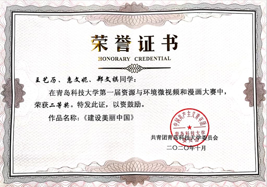 日前,由校团委、环境与安全工程学院联合举办的青岛科技大学首届资源与环境微视频和漫画大赛获奖名单揭晓,由海洋学院王倩老师指导的微视频作品《建设美丽中国》获二等奖,团队成员由学院王艺历、惠文妮、郑文祺等五位同学组成。