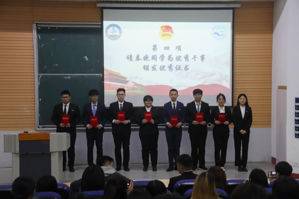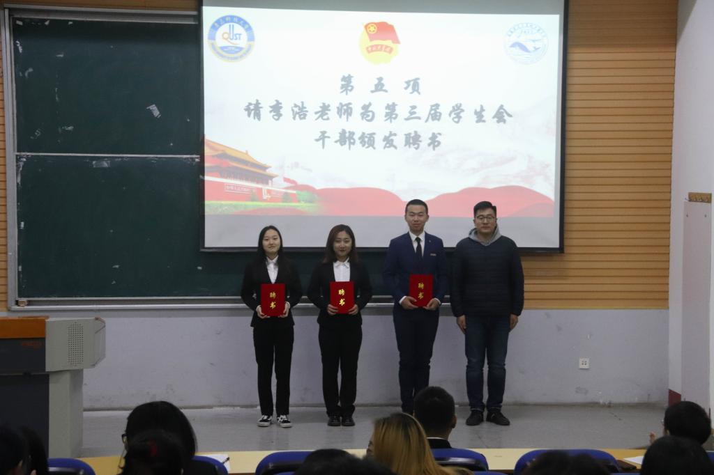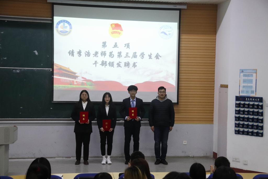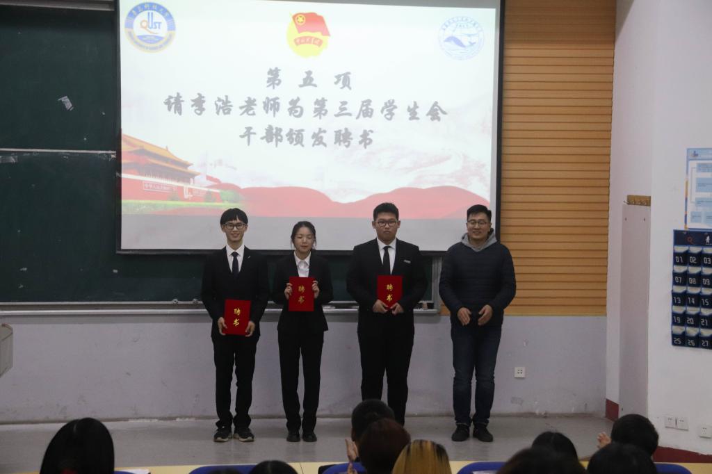 秦晓为海洋学院第二节优秀学生干事颁发荣誉证书。李浩为海洋学院第三届学生会部长副部颁发聘书。