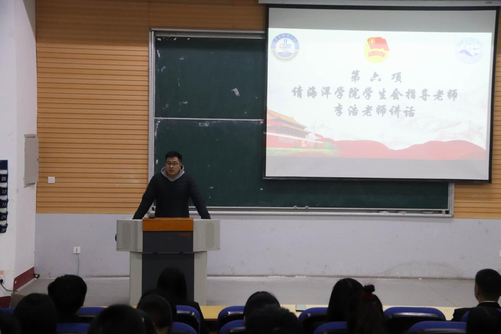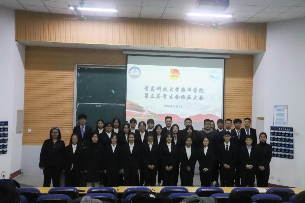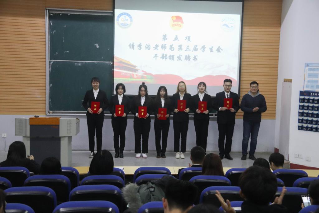 为表彰先进,总结经验,更好做好学生会工作,12月9日晚,海洋学院第三届学生会换届大会在二教101举办。海洋学院学工办主任兼团委书记、学生会指导老师李浩老师,第二届学生会副秘书长秦晓,全体海洋学院第三届学生会成员参加换届大会。